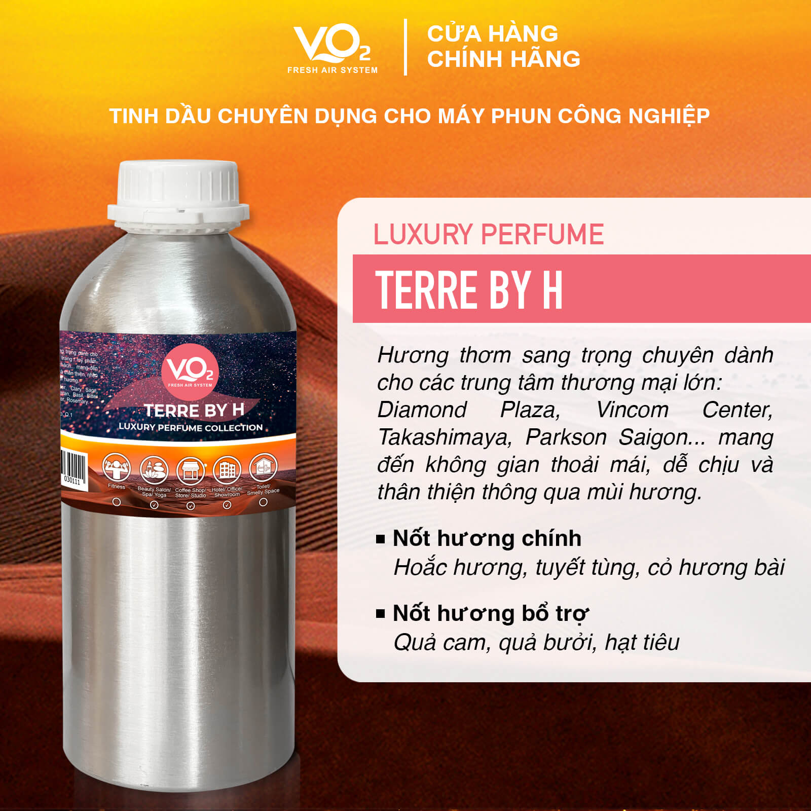 VO2 Luxury Perfume - Terre by H là dòng tinh dầu nước hoa cao cấp, được thiết kế riêng cho máy phun công nghiệp, mang đến hương thơm độc đáo và đẳng cấp. Lấy cảm hứng từ mùi hương biểu tượng của Terre d’Hermès, sản phẩm giúp tạo nên một không gian sống và làm việc thanh lịch, mạnh mẽ và đầy cuốn hút.
