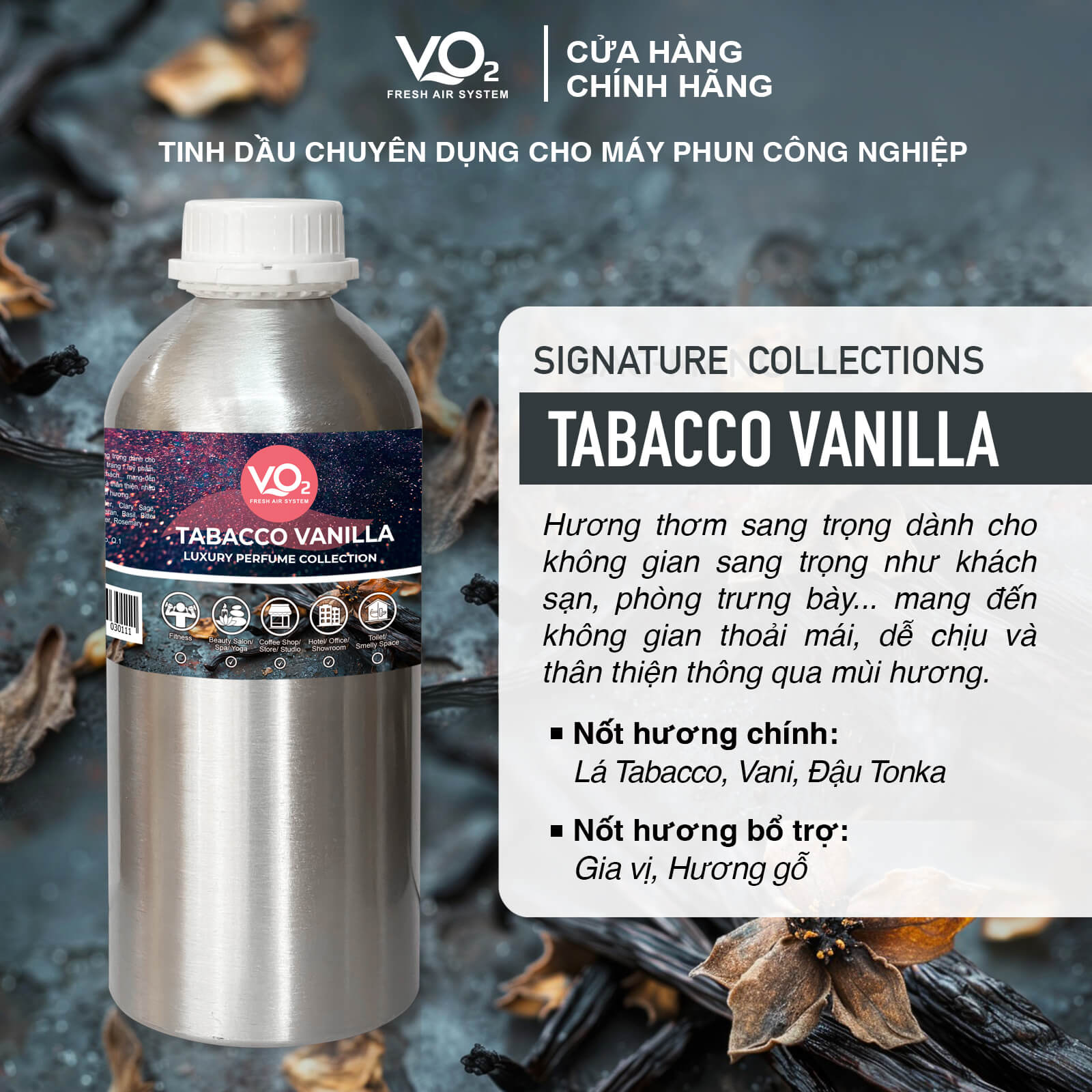 Tinh Dầu VO2 Luxury Perfume Collection - Tobacco Vanilla là sản phẩm đẳng cấp, được thiết kế đặc biệt cho máy phun công nghiệp, mang lại hương thơm nồng nàn và sang trọng. Sự kết hợp tinh tế giữa hương thuốc lá ấm áp, vani ngọt ngào, và gỗ trầm ấm giúp tạo nên một không gian đầy quyến rũ và ấn tượng, lý tưởng cho những địa điểm cao cấp như khách sạn, spa, nhà hàng, hoặc văn phòng doanh nghiệp.