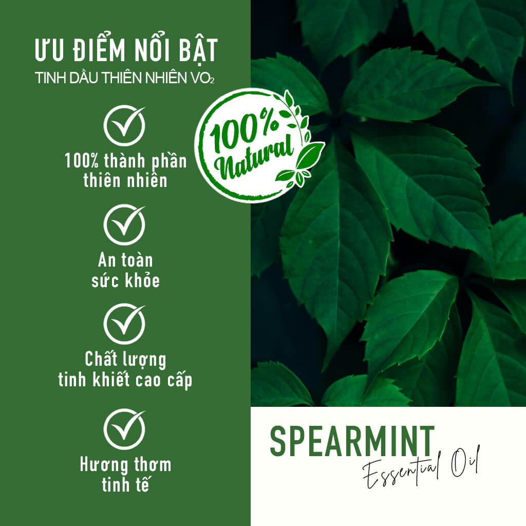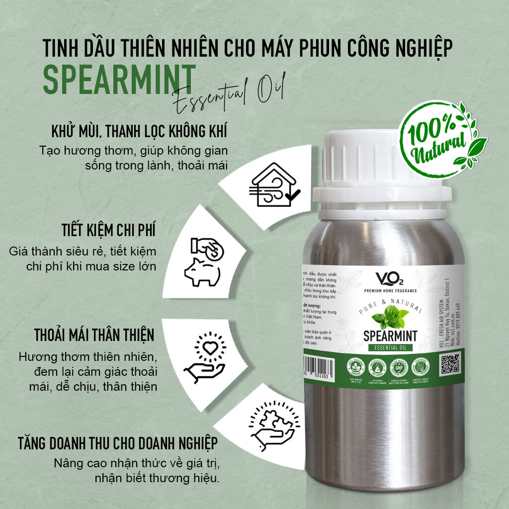 VO2 Pure Collection - Spearmint là dòng tinh dầu thiên nhiên cao cấp, chiết xuất từ lá bạc hà nguyên chất, mang đến hương thơm thanh mát, dịu nhẹ, và tràn đầy năng lượng. Được thiết kế chuyên dụng cho các máy phun tinh dầu công nghiệp, sản phẩm giúp thanh lọc không khí, khử mùi hiệu quả và tạo cảm giác sảng khoái cho mọi không gian.
